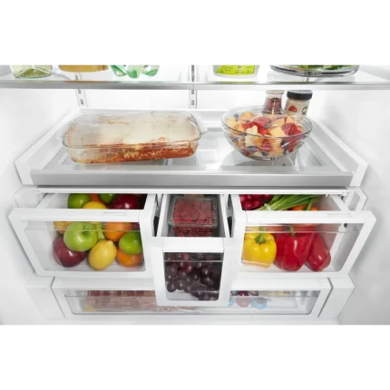Two refrigerator pull out drawers with clear fronts provide the perfect, sealed environment to keep your produce organized