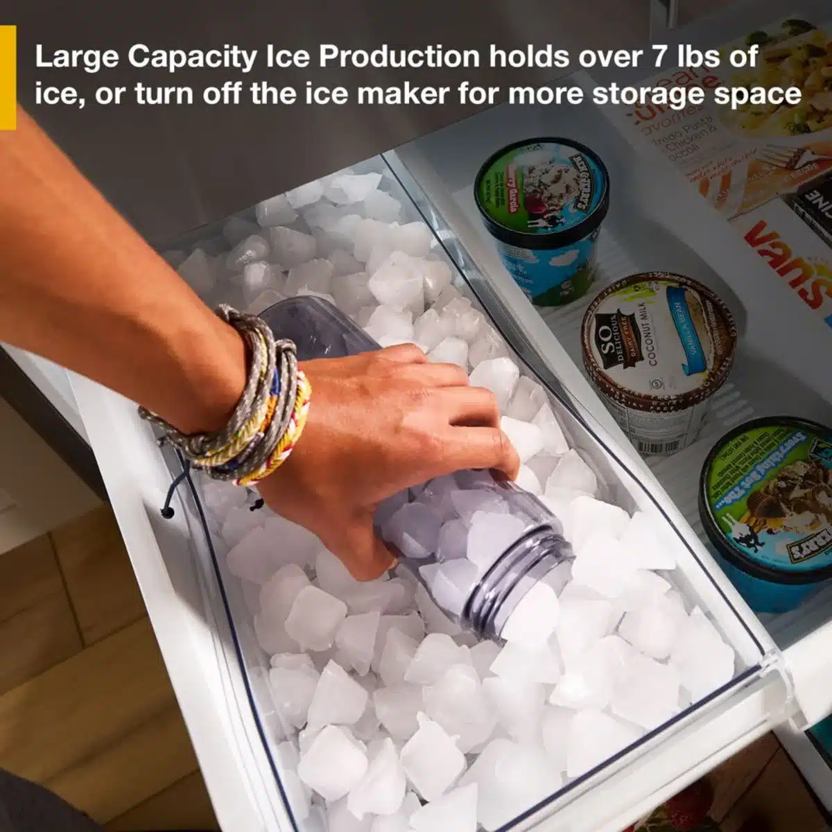 - Large Capacity Freezer Ice stores over 7 lbs of ice with built-in ice maker in freezer. Use it to fill the cooler, or turn it off for additional frozen storage space.