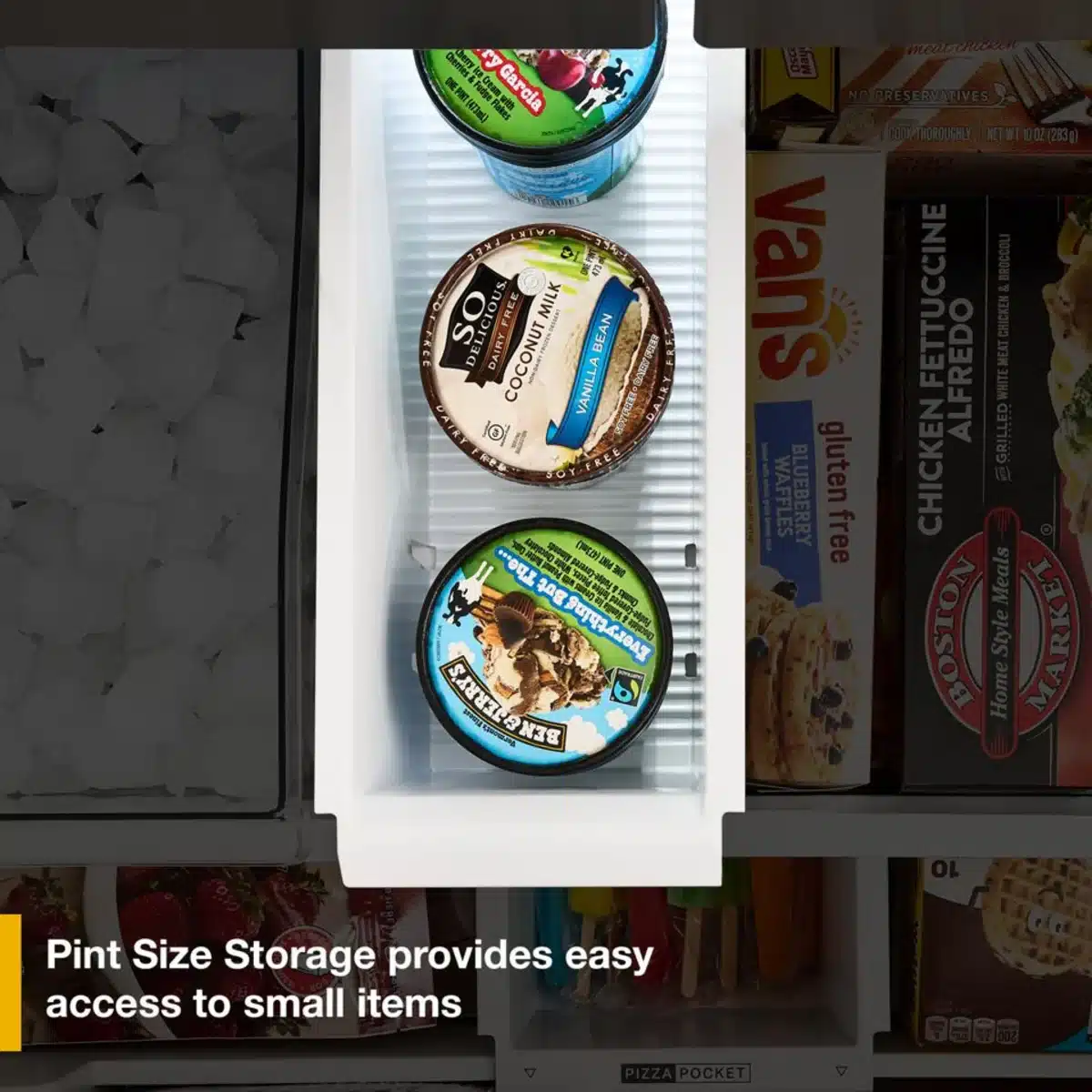 - Pint Size Storage provides easy access to frozen snacks and pint-sized ice cream, so they won’t get buried in your freezer.